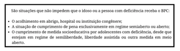 Pelo exposto, a situação de reclusão em regime fechado impede o recebimento do benefício. Vale destacar, então, quais as situações que não impedem o recebimento do Benefício de Prestação Continuada.