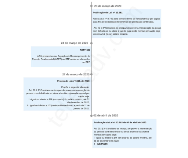 Mesmo com todas as tentativas de não permitir a ampliação de acesso ao BPC, foi publicada a Lei nº 13.981, de 23 de março de 2020, que “altera a Lei nº 8.742, de 7 de dezembro de 1993 (Lei Orgânica da Assistência Social), para elevar o limite de renda familiar per capita para fins de concessão do benefício de prestação continuada.”