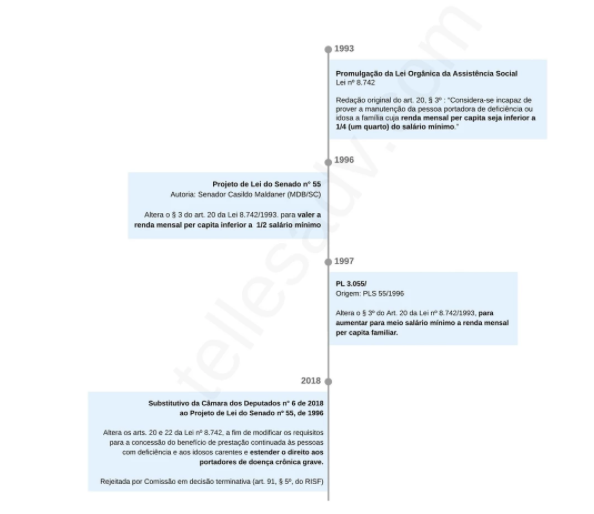Esse Projeto de Lei ficou em tramitação por mais de 20 anos até que, em 2018, a Câmara dos Deputados apresentou um substitutivo ao Projeto de Lei do Senado nº 55/1996, que visava modificar os requisitos para a concessão do BPC às pessoas com deficiência e aos idosos carentes e estender o direito aos portadores de doença crônica grave. Embora muito interessante, a proposta foi rejeitada por Comissão em decisão terminativa (art. 91, § 5º, do RISF) e a tramitação foi encerrada. Valendo, então, o Projeto de Lei nº 55 de 1996.
