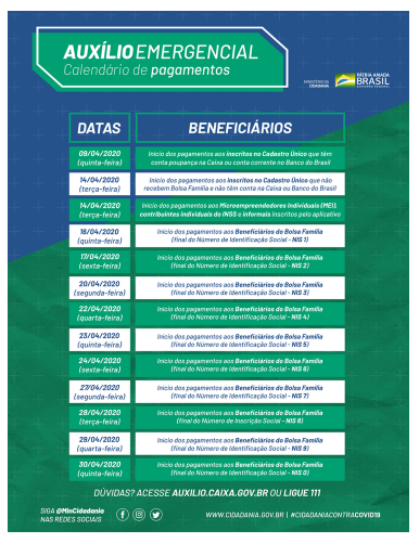 Ministério da Cidadania – Secretaria Especial do Desenvolvimento Social. Auxílio Emergencial de R$ 600 – tire suas dúvidas e baixe o aplicativo. Disponível em: http://desenvolvimentosocial.gov.br/auxilio-emergencial/auxilio-emergencial-de-600. Acesso em: 09 abr. 2020.
